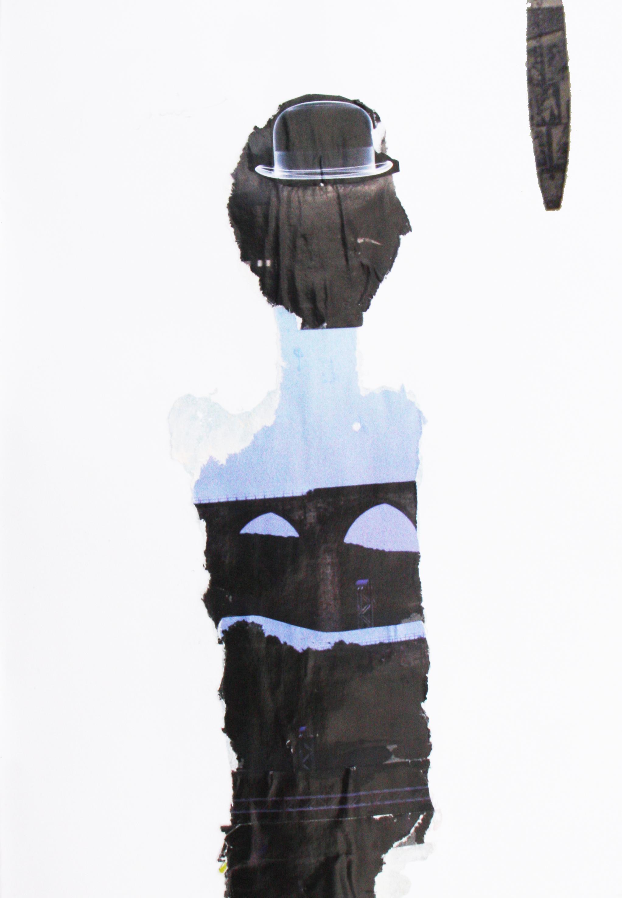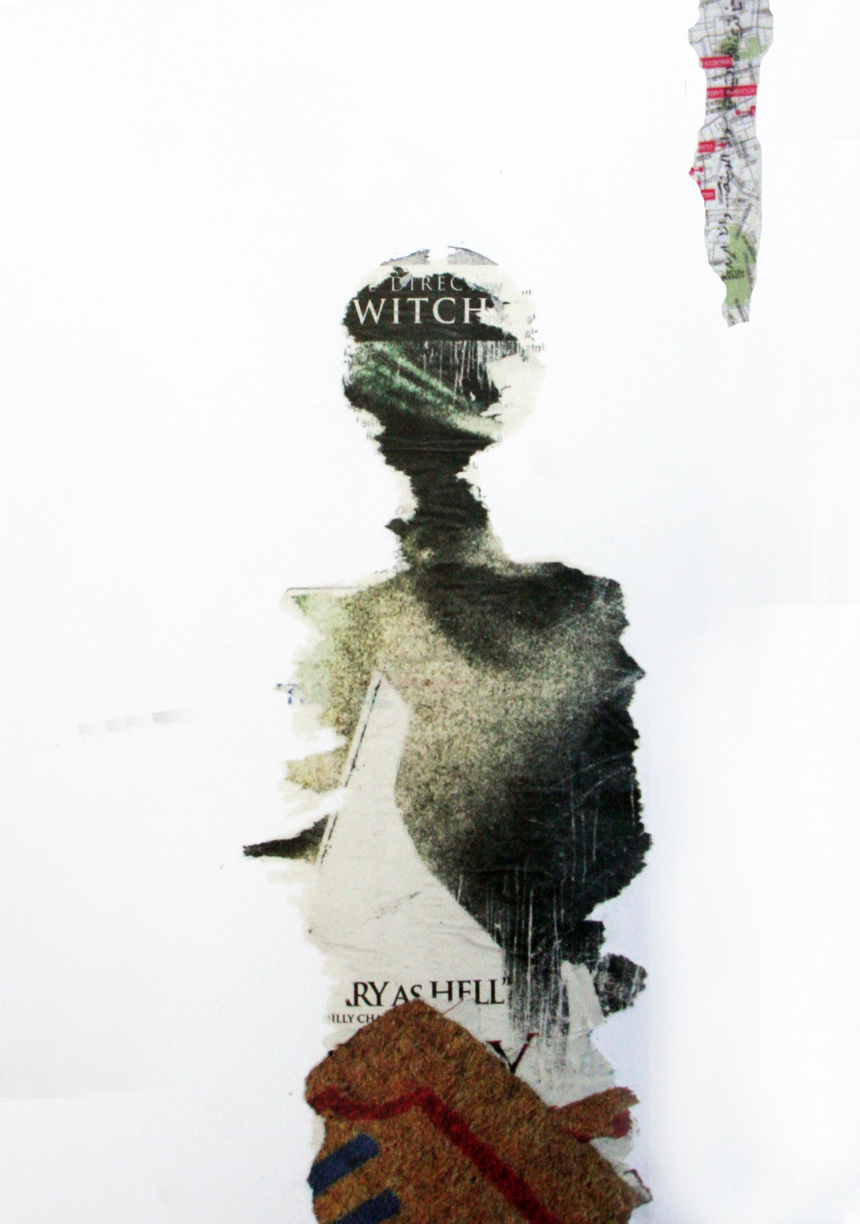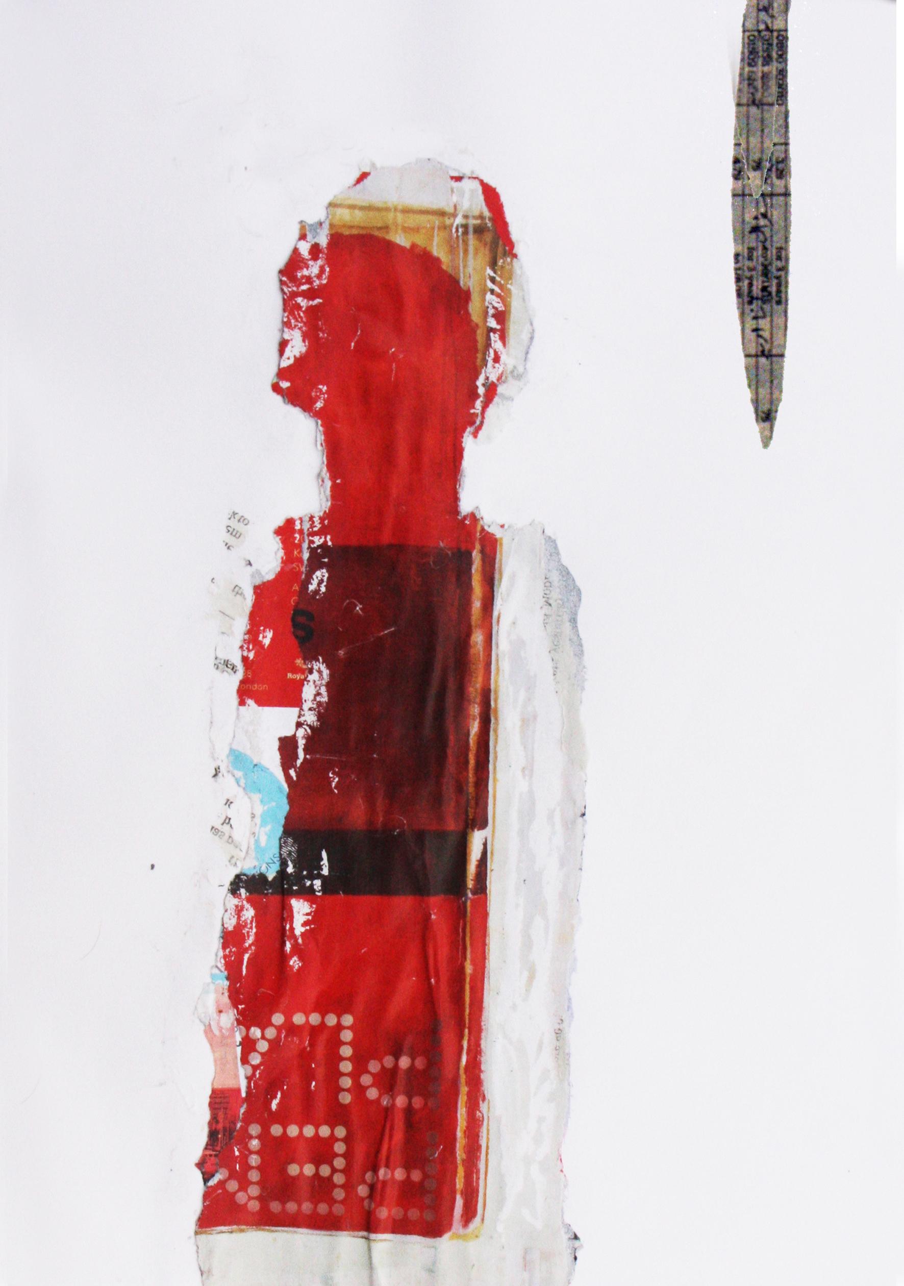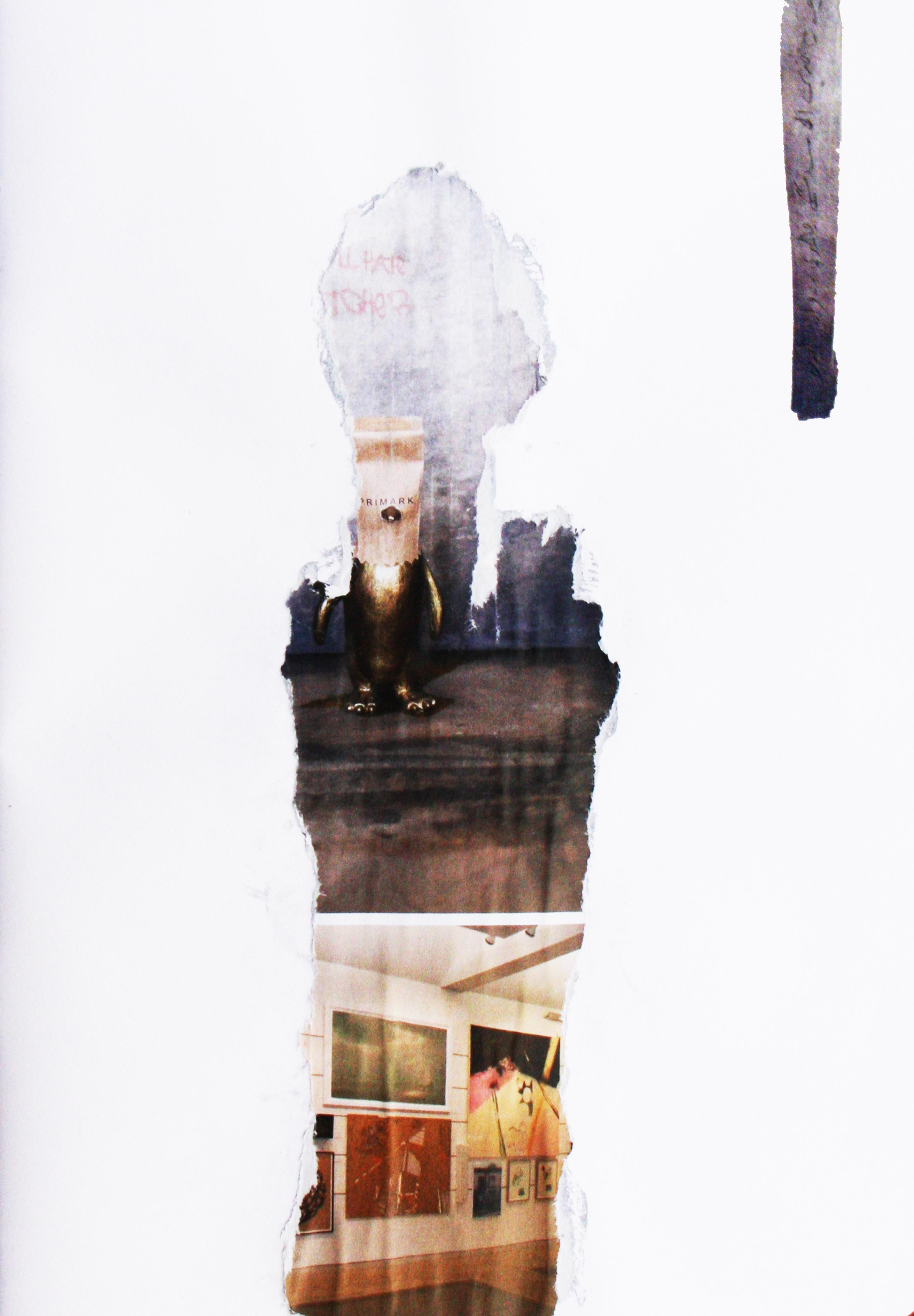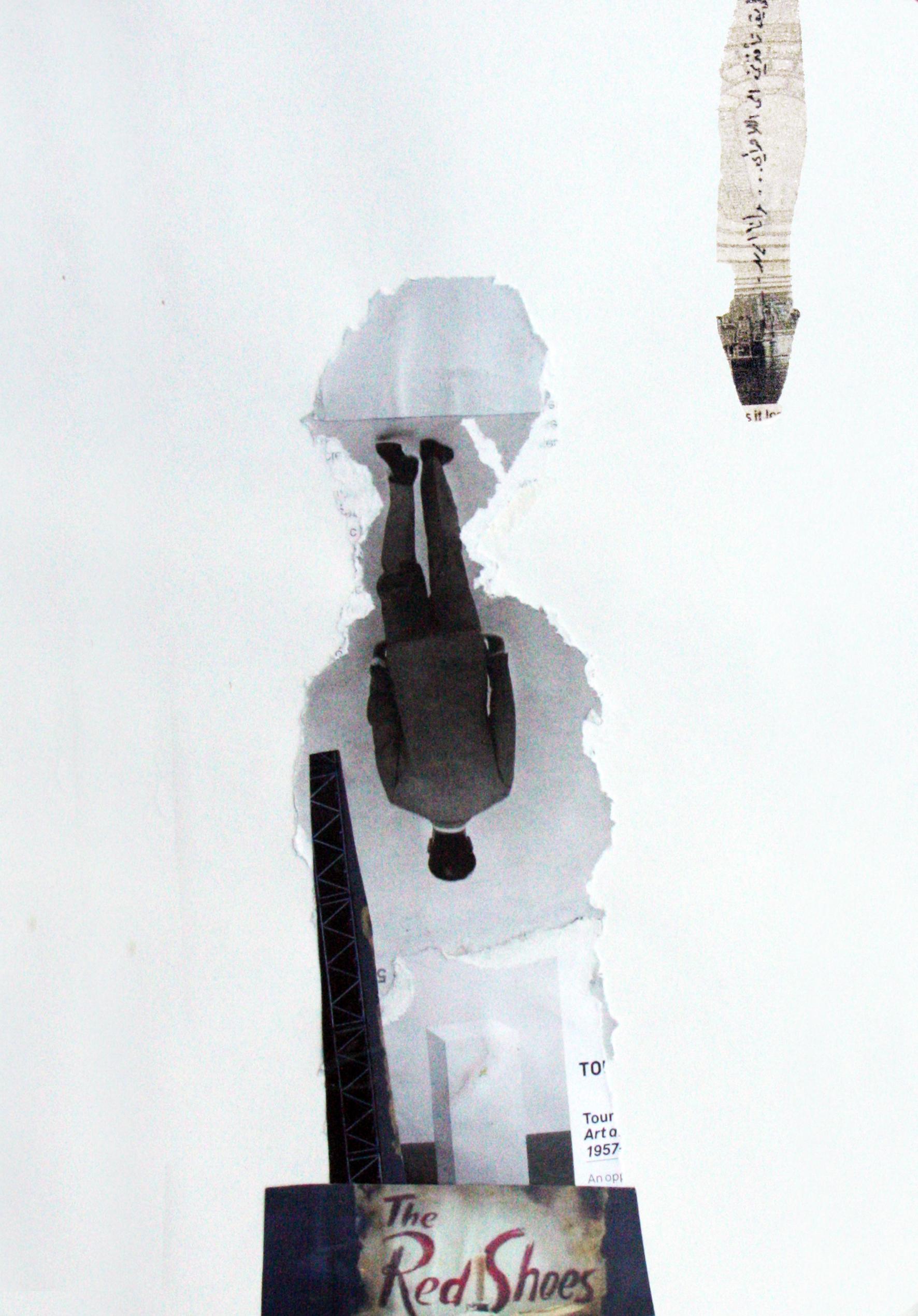 In his collages the artist offers records of his daily excursions during his time in London. In this series of approximately sixty pieces unique mixed media works on paper, an individual silhouetted ‘self-portrait’ figure is composed of randomly collected paper clippings from Alhroub’s regular excursions to places he’s visited or passed through. The transferral of normal daily activities from a public to private context later becomes part of a personal memory represented in a visual collage linked to an act. This act is subsequently associated with a time and a place to become a diary, a key to a memory somewhere. This action presents questions about the value of the artwork... who, how and why?