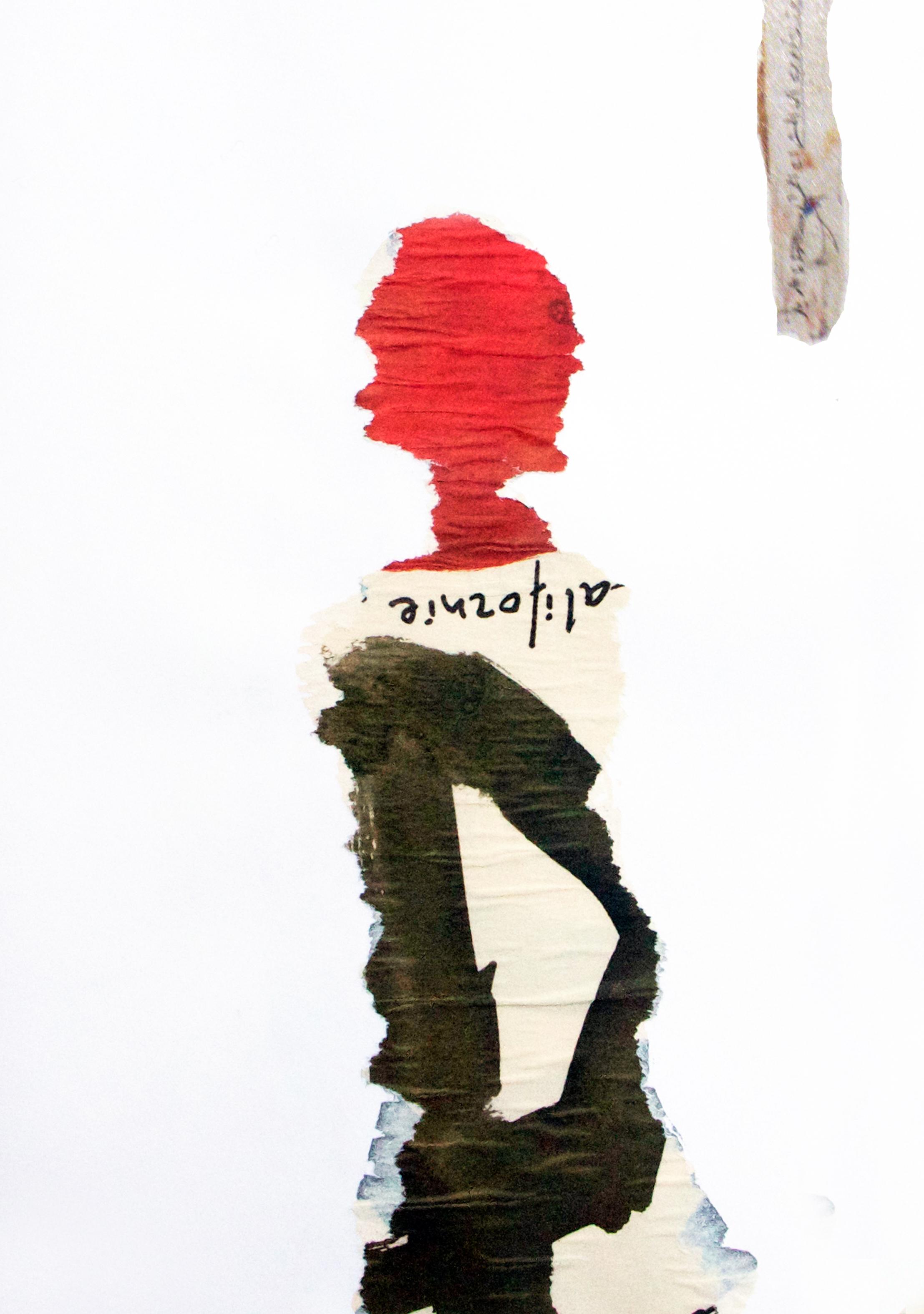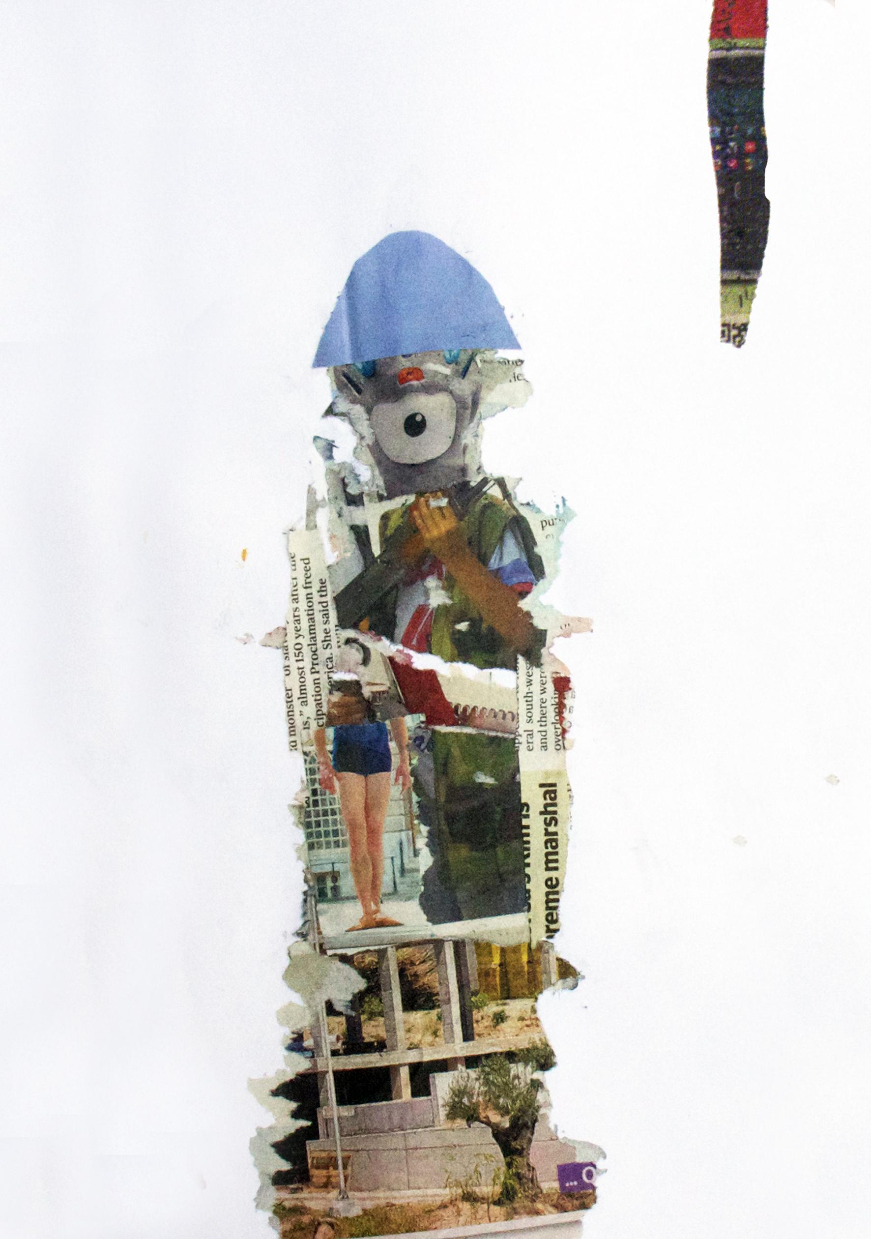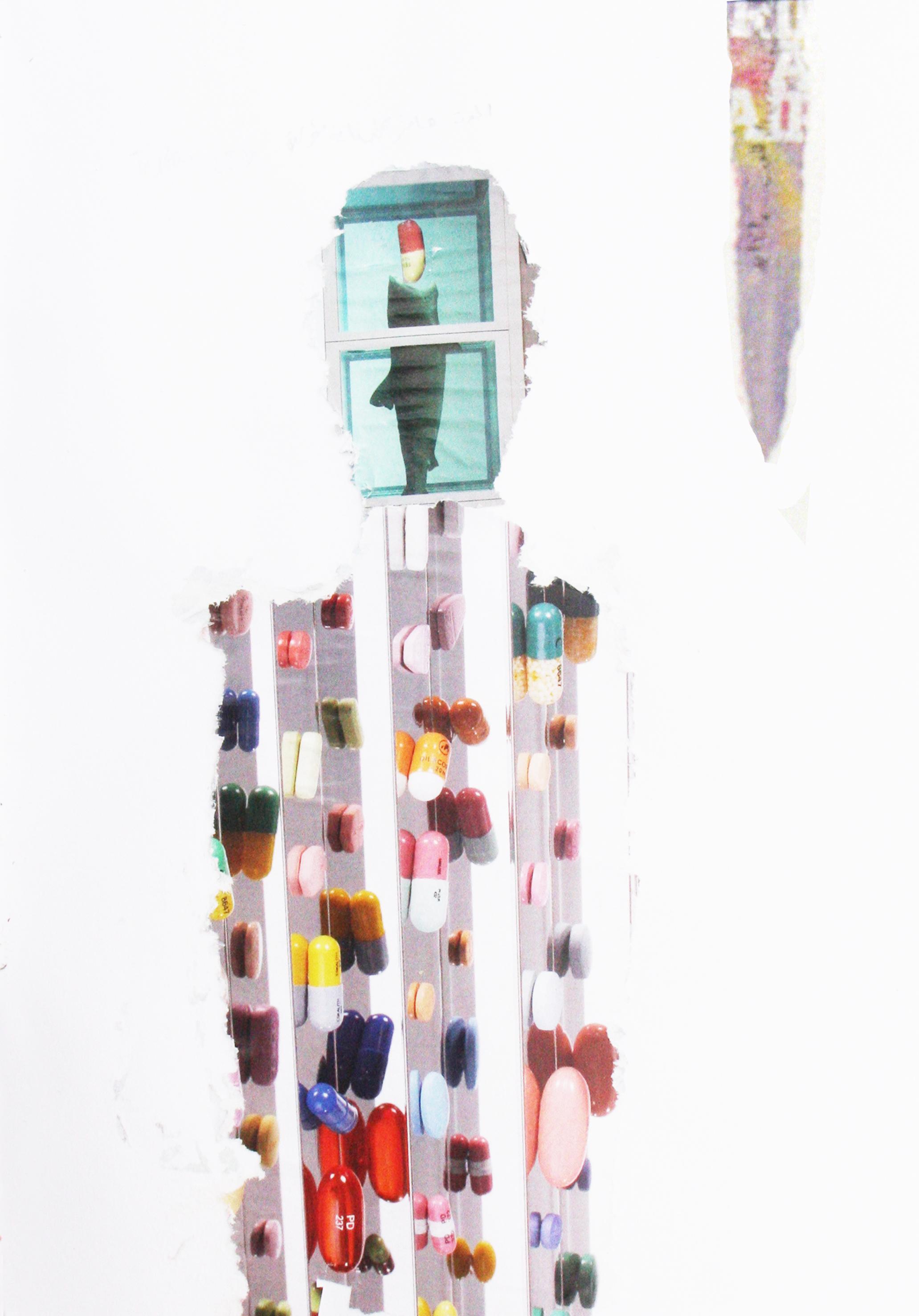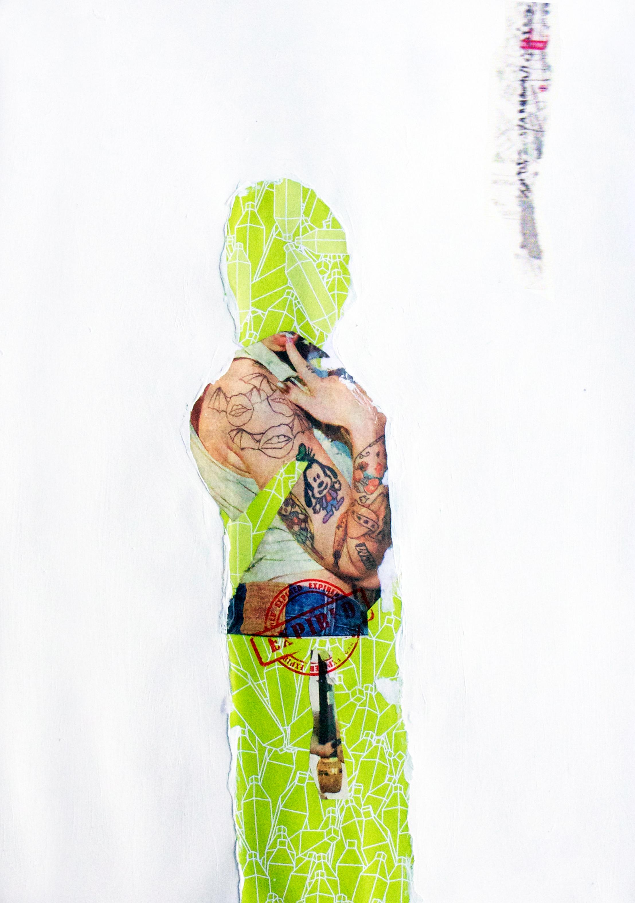 In his collages the artist offers records of his daily excursions during his time in London. In this series of approximately sixty pieces unique mixed media works on paper, an individual silhouetted ‘self-portrait’ figure is composed of randomly collected paper clippings from Alhroub’s regular excursions to places he’s visited or passed through. The transferral of normal daily activities from a public to private context later becomes part of a personal memory represented in a visual collage linked to an act. This act is subsequently associated with a time and a place to become a diary, a key to a memory somewhere. This action presents questions about the value of the artwork... who, how and why?