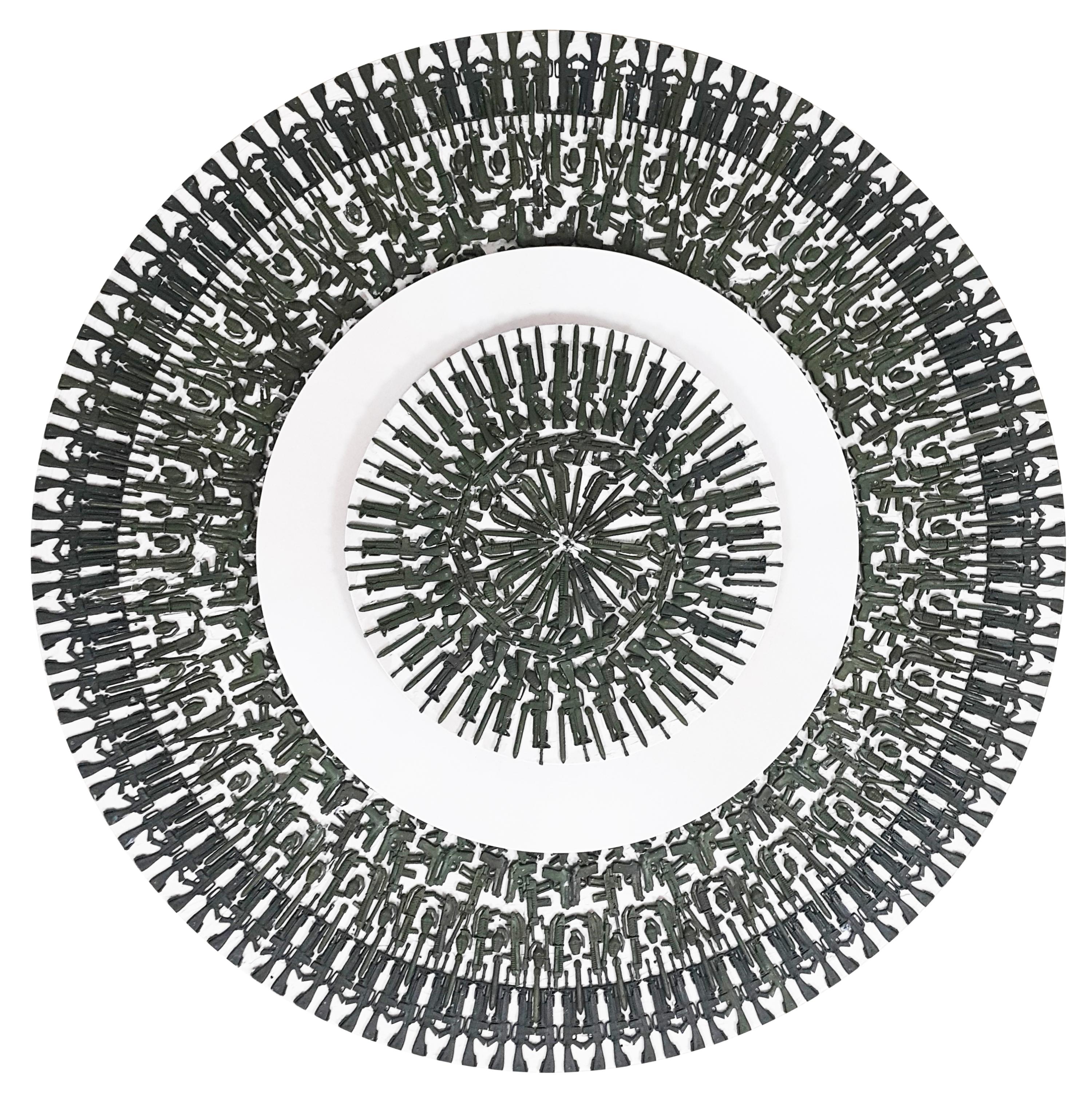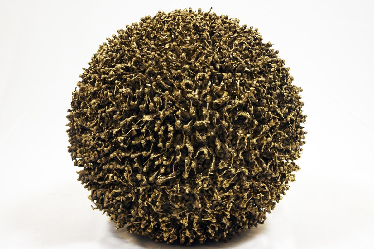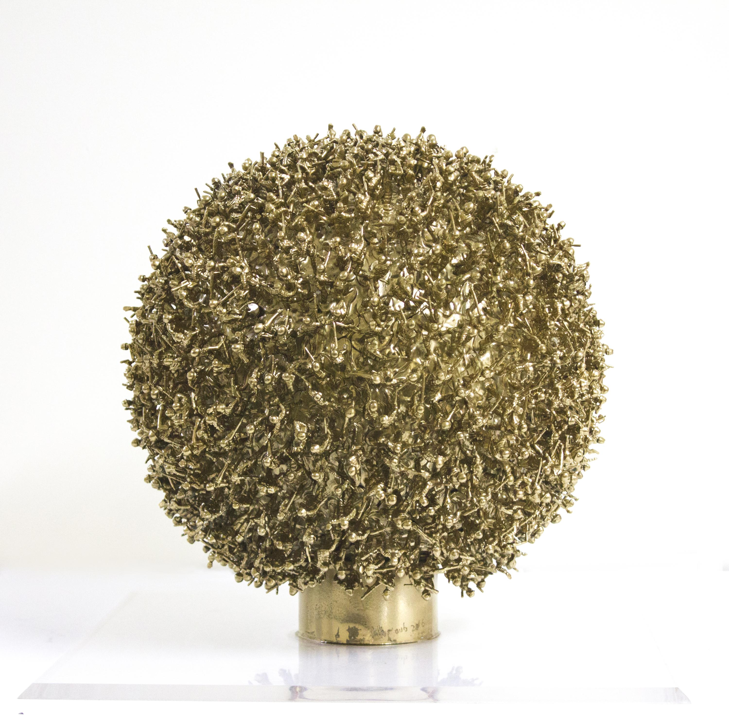 The Palestinian economy is a special case in that it is an “occupied economy”, as defined by Palestinian economic researcher Nour Arafeh in her study on the “Legend of Palestinian Economy”. Moving towards cultural economy, we notice that as a visual multi-medium artist, Alhroub deliberately used this material –if we want to define the “green soldier toys” or “action figures” as a useable material or subject. We must assert here that the artist used these figures for a conceptual purpose, in that he attempts to study the possible aesthetic use of these small military figures. Consequently, the artist employs them as units/particles to form structures based on the physical relations between the particle and the whole. This is similar to a structured architectural work. Alhroub adopts this aesthetic strategy, which works well with his idea and implementation, throughout his artistic career as a conceptual multi-medium artist. We can also notice that these forms develop as a holistic sculptural project maintaining an unstable geometric relationship between the unit and the group. This strategy is the aesthetic base proposed in this context as a geometric law that presents the 3D work in a semi-tense state between the particle and the whole.