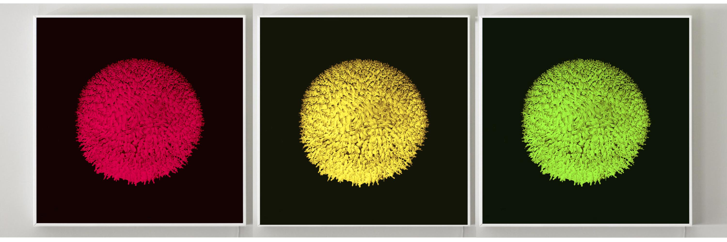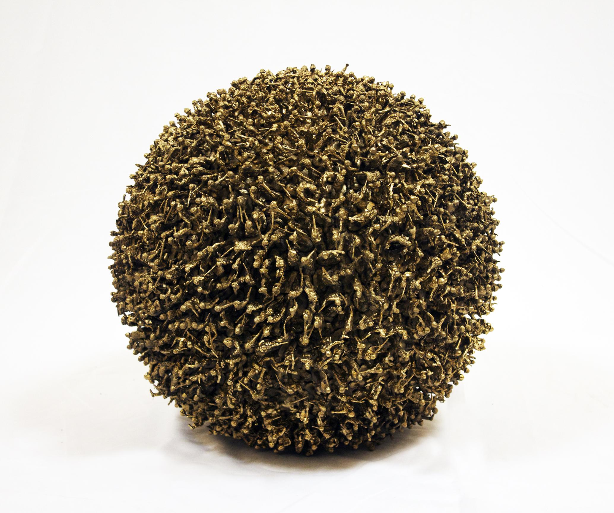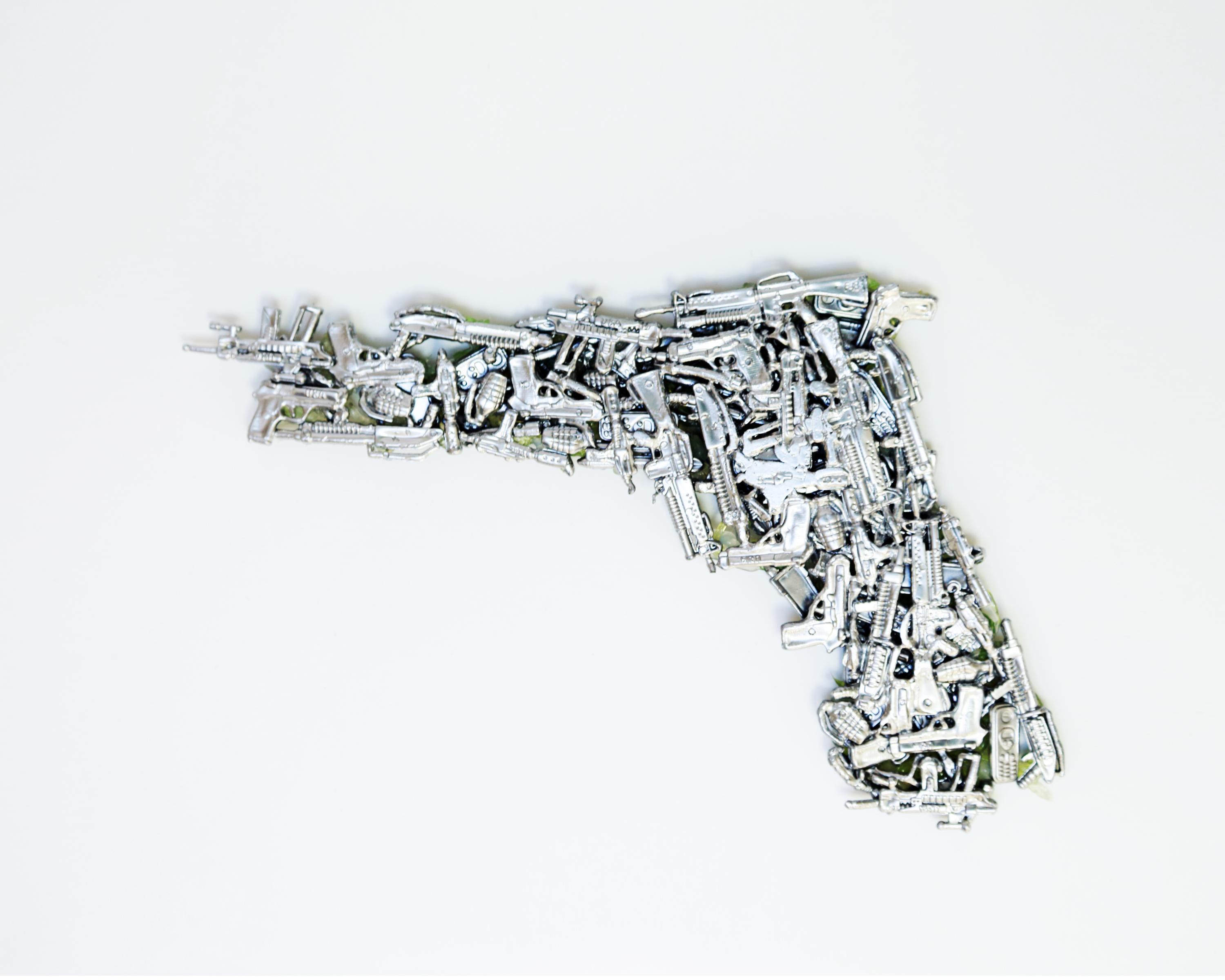 The Palestinian economy is a special case in that it is an “occupied economy”, as defined by Palestinian economic researcher Nour Arafeh in her study on the “Legend of Palestinian Economy”. Moving towards cultural economy, we notice that as a visual multi-medium artist, Alhroub deliberately used this material –if we want to define the “green soldier toys” or “action figures” as a useable material or subject. We must assert here that the artist used these figures for a conceptual purpose, in that he attempts to study the possible aesthetic use of these small military figures. Consequently, the artist employs them as units/particles to form structures based on the physical relations between the particle and the whole. This is similar to a structured architectural work. Alhroub adopts this aesthetic strategy, which works well with his idea and implementation, throughout his artistic career as a conceptual multi-medium artist. We can also notice that these forms develop as a holistic sculptural project maintaining an unstable geometric relationship between the unit and the group. This strategy is the aesthetic base proposed in this context as a geometric law that presents the 3D work in a semi-tense state between the particle and the whole.