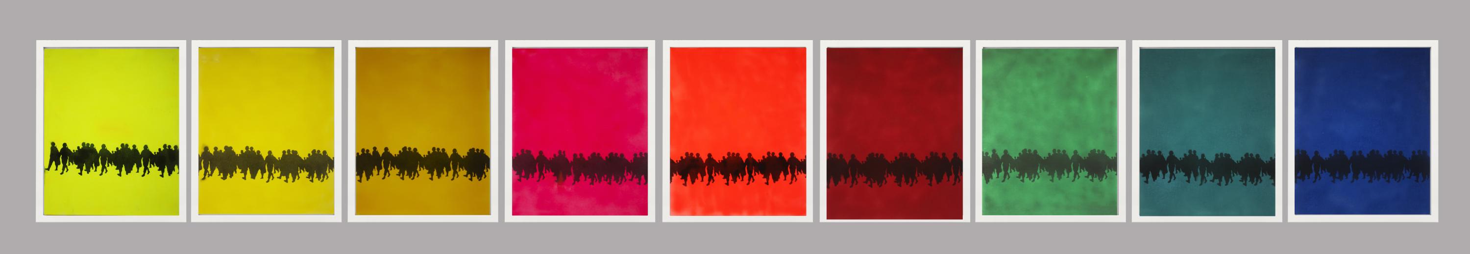 In Alhroub’s paintings and drawings, he reproduces the scene with a series of paintings that make up a comprehensive work through partitions colored in a rainbow spectrum. This work connects the strained scene of manly erotic attitude with “military” life and the troubled sexual relations in the taunted military community. As Alhroub introduces a strong gender question about “desire”, one must open an intellectual dialog with Joseph Mass’ad in his book “Arabs’ desiring”. In his book, Mass’ad thoroughly analyzes the relationship between imperialism and Arabs by examining the history of manhood and colonization. Meticulously, Alhroub was able to open a different argumentation with regards to the typical narrative in Palestinian culture. As recipients, we are constantly wondering about Alhroub’s strategy: Why does he continue to raise these questions from his position as a conceptual artist who brings together aesthetic in its popular perspective, and violence as a practice, a state and an experiment, in constant tension with desire, as an instinctive state of being that is close to an animal instinct? Or perhaps we should tackle the direct question: Does the human historical conflict go back to the biblical narrative of Cain and Abel, sons of Adam, and is it an ongoing historical phenomenon? Or have we overcome this history to embrace a colonial present whose roots go back to the European colonial project and all of its consequences? The artist raised these philosophical questions and ideas through his works, which are presented as structures with a grace that swings between primitive and modern ages. Is it sane to speculate that Alhroub using these figures leads the viewer to face a crisis through which the latter tries to build a relational connection to a piece of art charged with ridiculed features? Such features cause the viewer to wonder about the issue of violence and its visual translation! If that is, in any case, even possible!