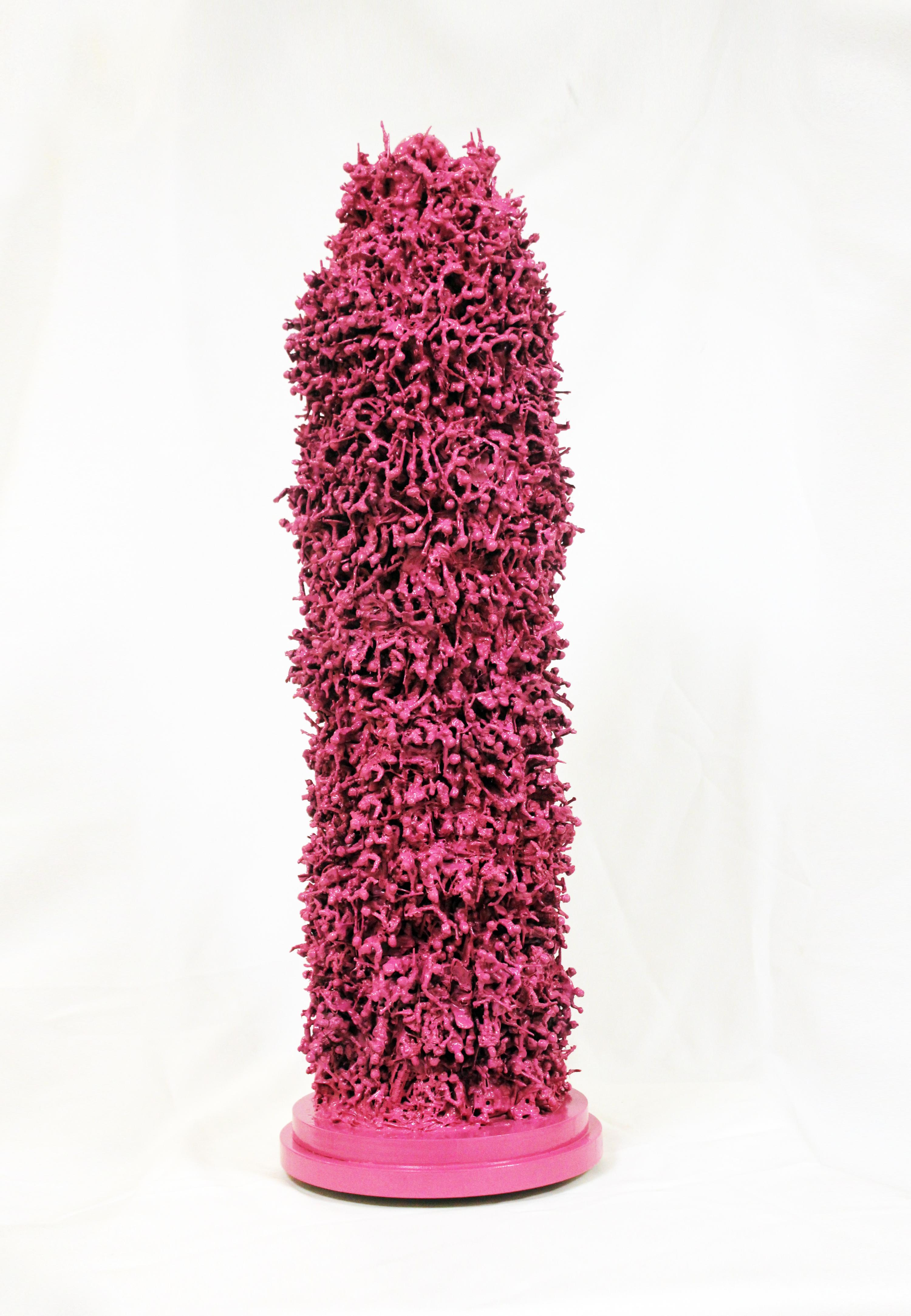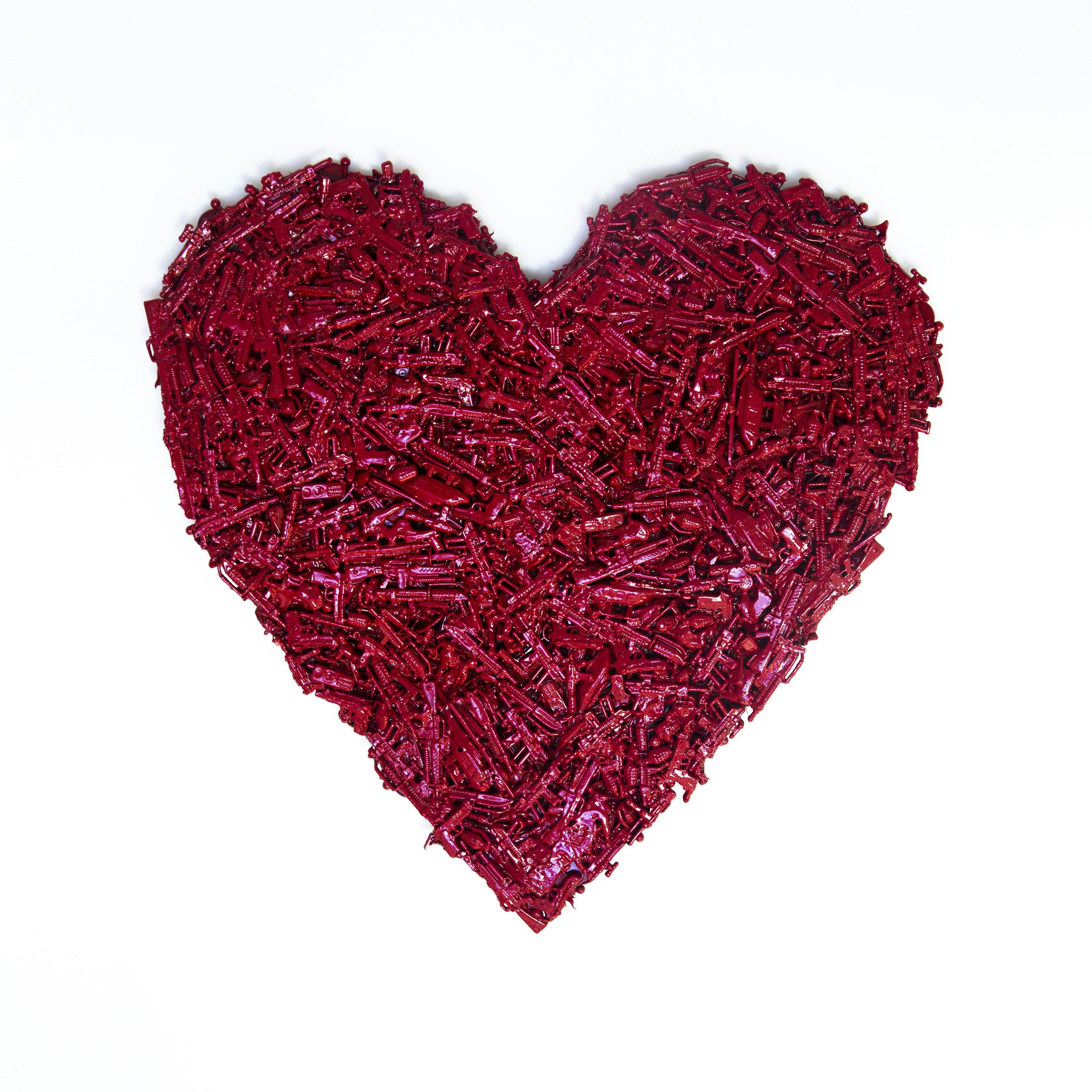 Alhroub’s works represent metaphorical concepts of violence and eroticism as an aesthetic state. It highlights the complex relation between desire and violence as manly military actions with origins from the history of war, triumph and defeat. With these hybrid works, Alhroub tries to establish a tense relationship between the sculpture and the viewer/ the recipient/ the dealer. Looking at sculpture (number 1), presented in the form of a missile, if one recognizes it as a missile from first glance, one cannot ignore the fact that the artist used the color “pink” or “magenta”, a color symbolizing femininity, desire and romance. The color pink, promoted through western marketing programs in the beginning of the 19th century in the United Kingdom, has today become a feminine color par excellence. Should one consider the artist’s choice of color and shape simply a coincidence? Or did he mean to link the color, as an economic geo-political gender symbol, to the writing of war’s history as a dominating masculine mission? Perhaps the artist meant to present a feminine missile, if one looks at it from a humoristic aesthetic perspective. This brings us to sculpture (number 2) where Alhroub created the shape of a romantic heart and painted it bright red. Thus, he reformulates the military game to become an object of desire and eroticism. What does the infusion of a series of plastic military subjects into shapes derived from war and love mean? Alhroub’s hybrid works now lie in the erotic aesthetic center that deepens the tension between violence and desire as a military act. Here, an act which the artist built through his attempts to simulate childhood, similar to a father who sets the playing strategies with his son “Omar” in the game of war. What came out from these innocent strategies!?